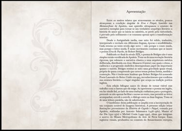 Eros & Psyche – A Poem in Twelve Measures, de Robert Bridges, é uma edição bilíngue de caráter literário e patrimonial, voltada a bibliotecas, livrarias especializadas, universidades, pesquisadores, poetas e leitores interessados em poesia clássica, tradução e tradição literária.